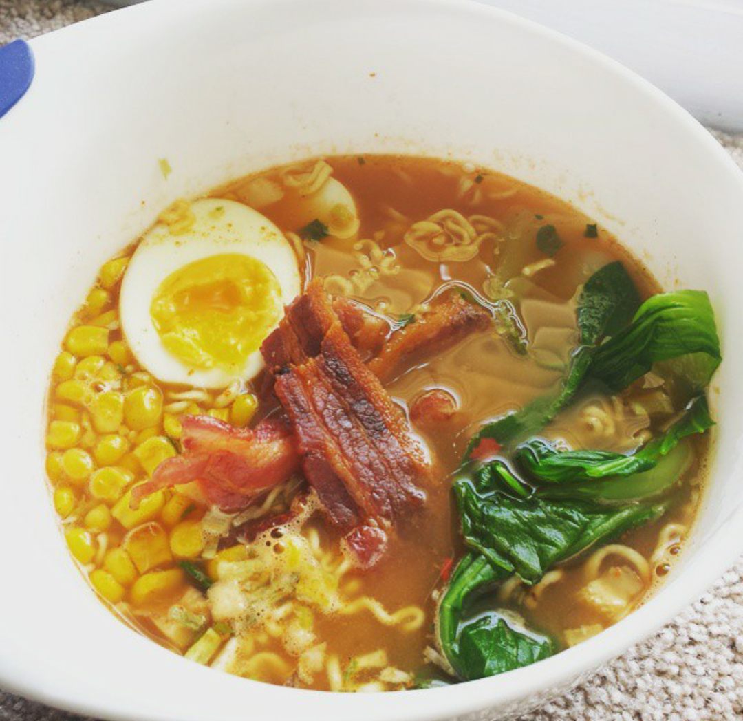 Fill up a pot big enough for your ramen noodles with water and bring to a boil. In another pot, add half cup of frozen corn and tablespoon of water, set on medium high, and stir occasionally until corn is heated. Once corn is heated, set off to the side. When water comes to a boil, gently place egg into it and boil for 3-5 minutes. Remove egg and run under cold water to stop cooking process. Gently peel off shell, place egg in soy sauce, and set off to the side. In same pot of boiling water, place ramen noodles and stir. Microwave three slices of bacon on paper towels both underneath and on top of bacon for 1 minute. Pat off excess fat with paper towel and microwave bacon again for 45 seconds to 1 minute, then put off to the side. Two minutes before ramen is finished cooking, add flavor packet and cleaned baby bok choy to the boiling water and stir for 1-2 minutes. Remove from heat. In serving bowl, add peanut butter and Sriracha. Mix in contents of ramen pot. Garnish with egg (halved), corn, and bacon strips.