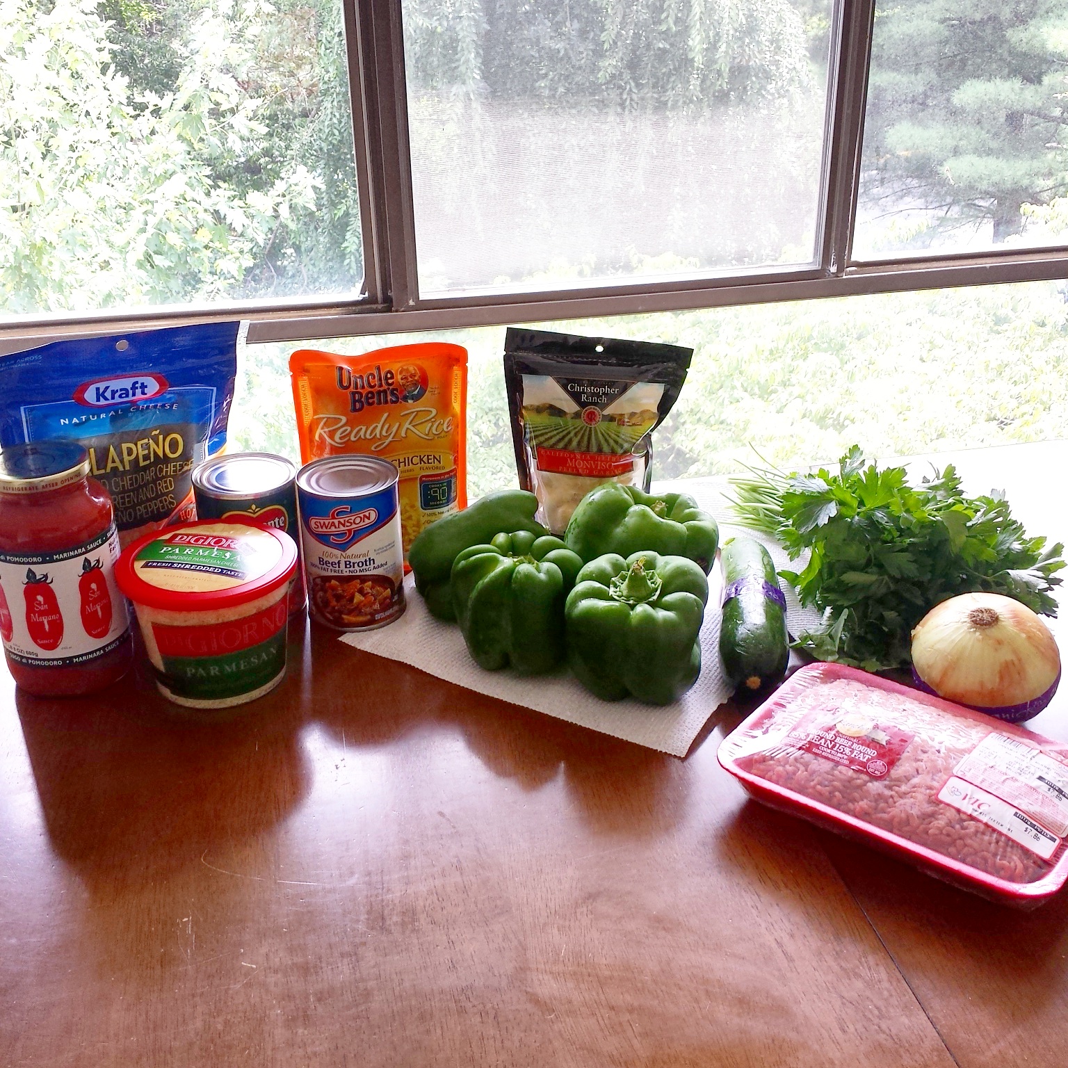 From left to right, we have marinara sauce (mine was made from san marzano tomatoes. I give those a thumbs up), JalapeƱo jack cheese (because they didn’t have pepperjack), parmesan cheese, diced tomatoes, a can of beef broth, ready made rice (roasted chicken flavor), four green bell peppers, garlic cloves, a zucchini, italian parsley (with the smooth leaf), a medium yellow onion, and ground beef. I forgot to include balsamic vinegar. I used about two tablespoons.