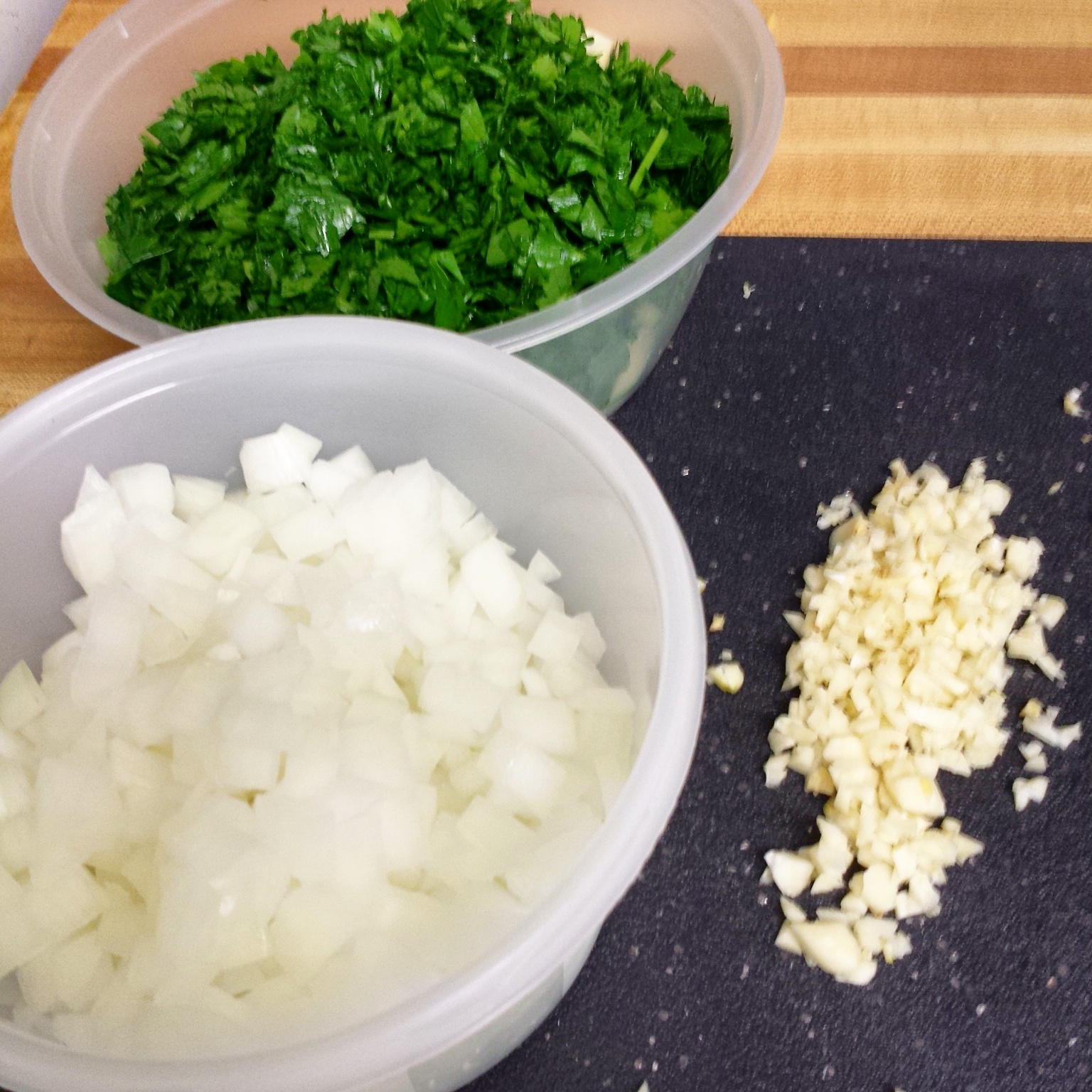 You can’t see the zucchini, but it’s essentially cubed and hidden underneath that heap of parsley. That’s about five garlic cloves all minced. In the recipe, I suggest using four or less. Five was great, but very in-your-face garlic-y.