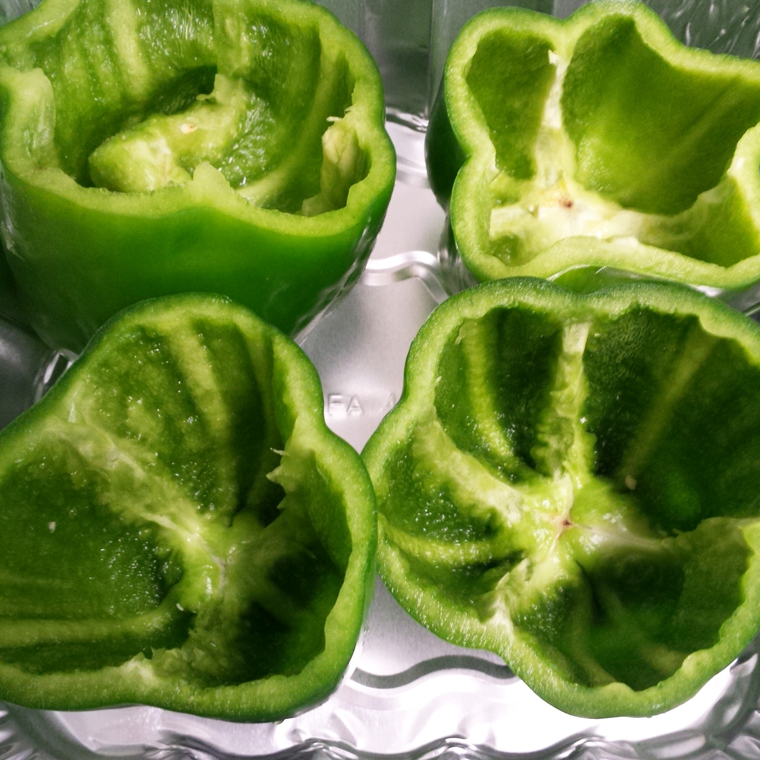 Bell peppers all prepared. Just cut off the tops, remove the seed cluster, and remove some of the white fleshy membrane inside of the pepper. I just used my fingers to pinch it off. You can use a spoon if you’d like.