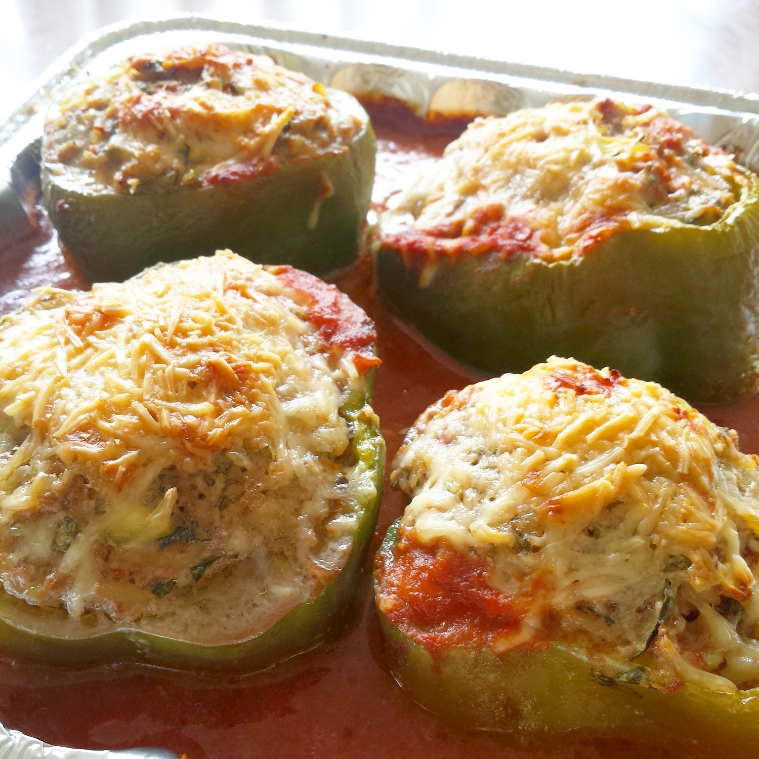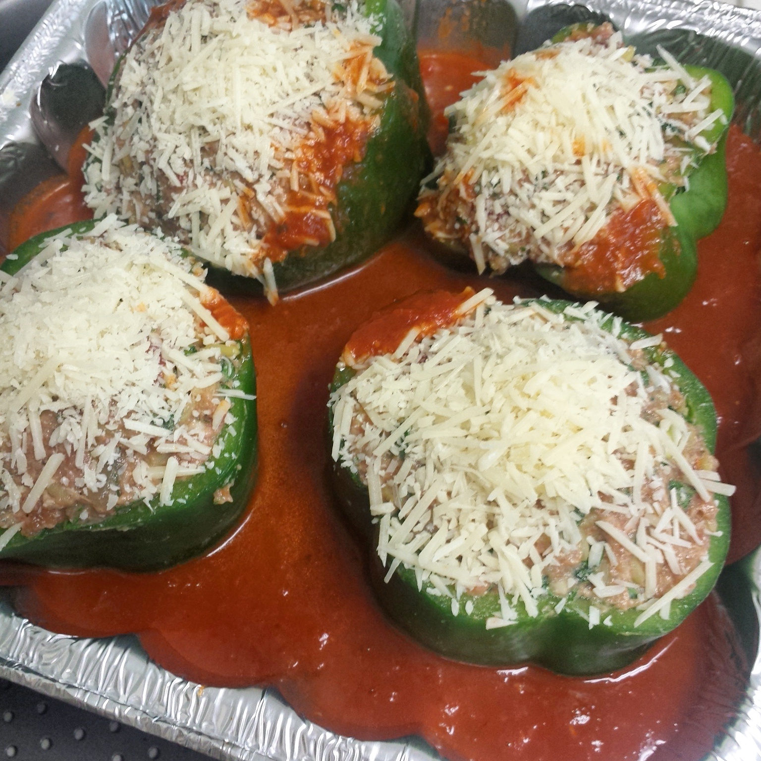 Make sure you pack that stuffing into the crevices of the peppers. I had some stuffing mixture left over, so I put it in tupperware and threw it in the freezer. I’ll find a use for it later. All that is left now is to cover the tops with parmesan cheese and add the sauce.