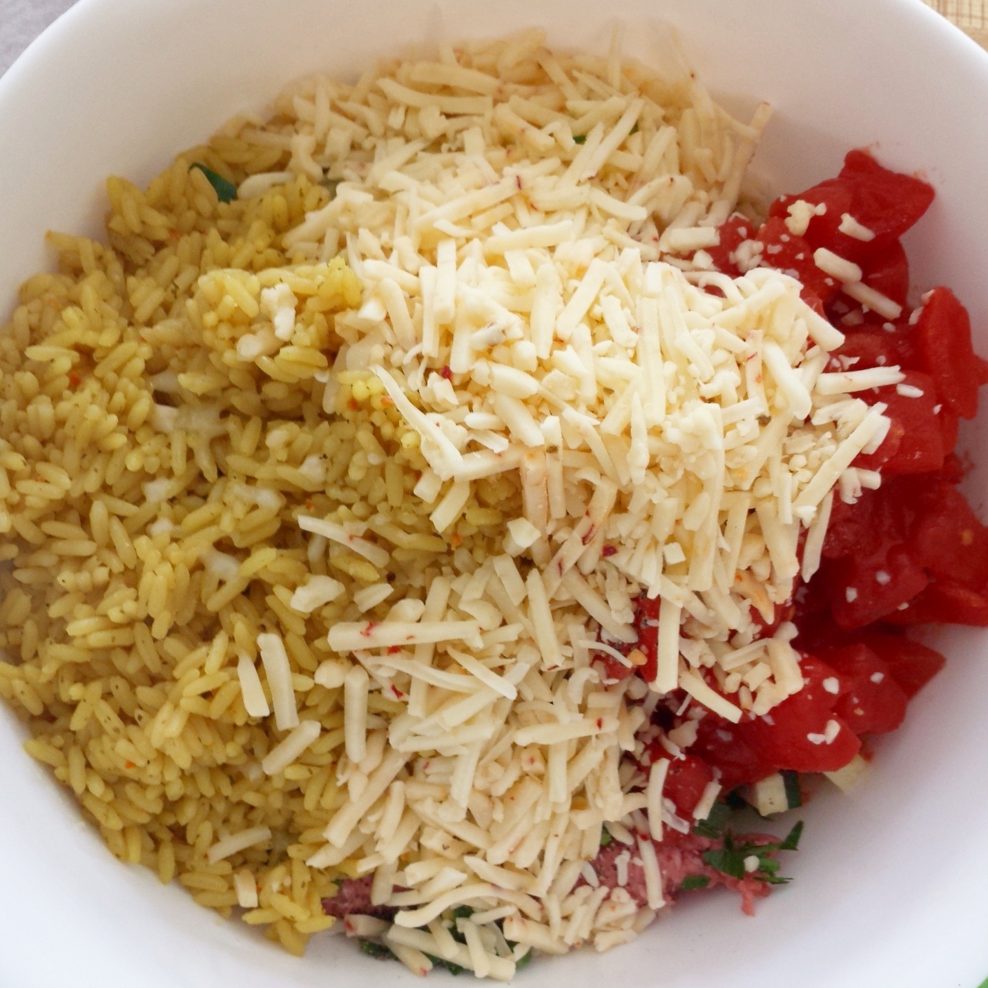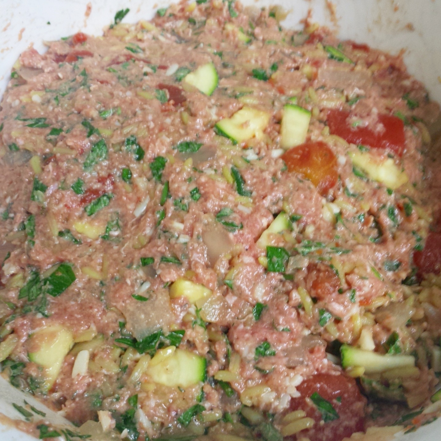 And of course, you can’t see anything. But just so you know, the bowl has in it the half of the onion that we cooked, the ground beef, about two tablespoons of salt, a teaspoon of black pepper, a couple of shakes of cayenne pepper, the parsley, the zucchini, the diced tomatoes, the rice, and the cheese. Some of the ingredients, like the rice and onions, may be HOT. That said, I advise beginning to mix this with a spoon. Then once, things are somewhat distributed, switch to your hand. I know, I know, it’s yucky, but there’s no better way to mix it. Here’s what mine looked like when it was done: