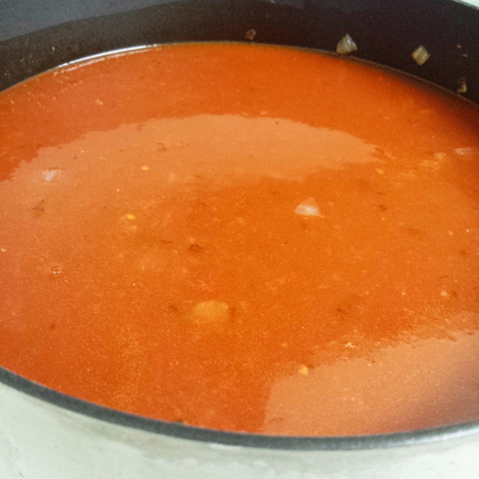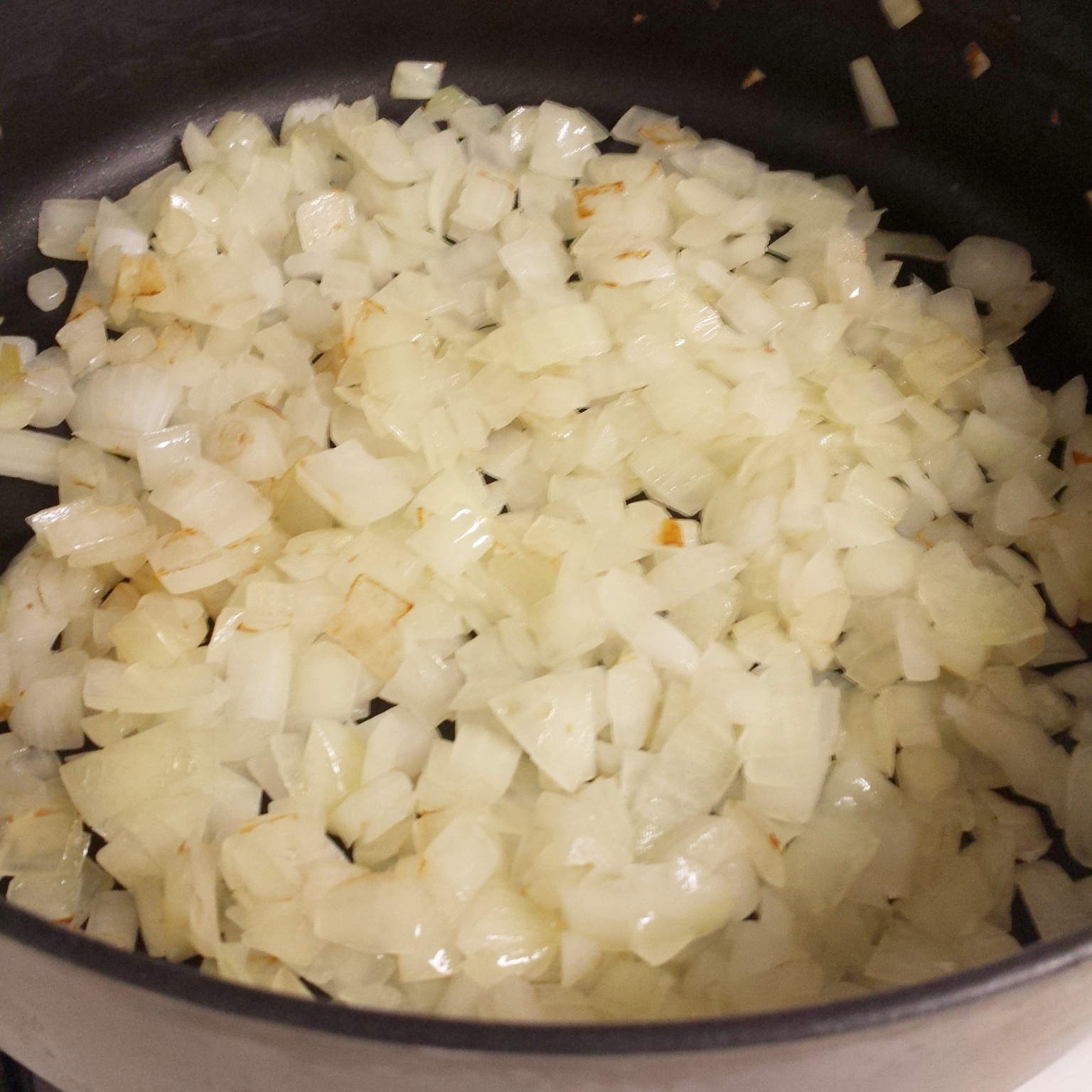 Time to saute the onions in a little oil and with a pinch of salt. When they look like this, remove HALF OF THEM, and add that half to the stuffing mixing bowl. With the remaining half, add marinara sauce, two tablespoons of balsamic vinegar, and the can of beef stock, and mix together. It will look like this: