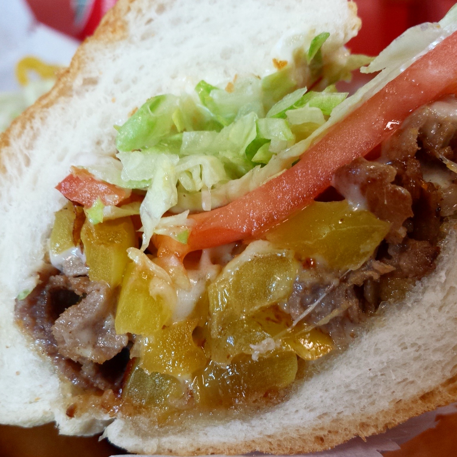 It’s there! It’s just covered by some stuff. And you know what? That stuff adds texture. The lettuce is a lot crunchier than you’d expect it to be. The tomatoes are fresh. And those acidic, tasty little banana peppers pack a bite that isn’t spicy––it’s tangy. Super tangy. Those banana peppers bleed onto the meat and make it so flavorful. There are two things I do not enjoy without banana peppers, and one of them is a cheesesteak.