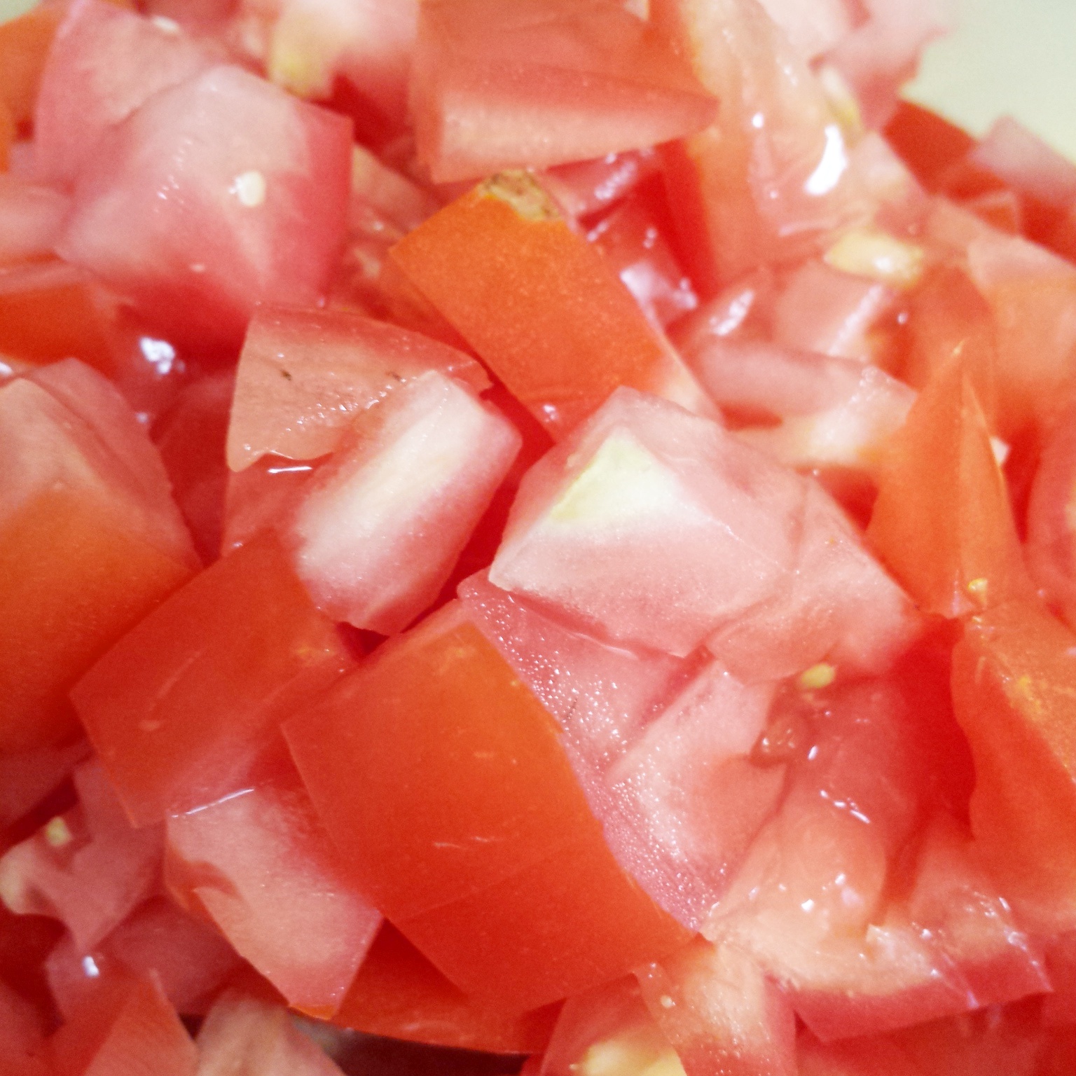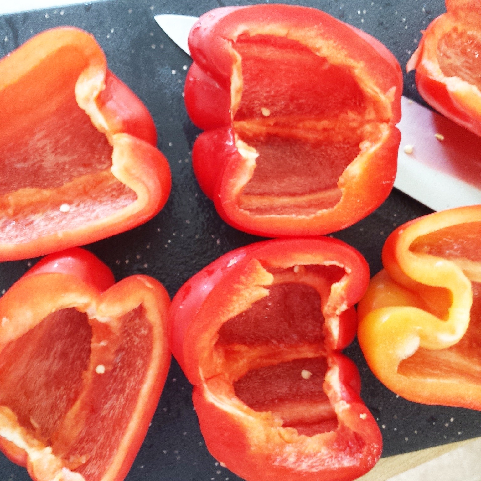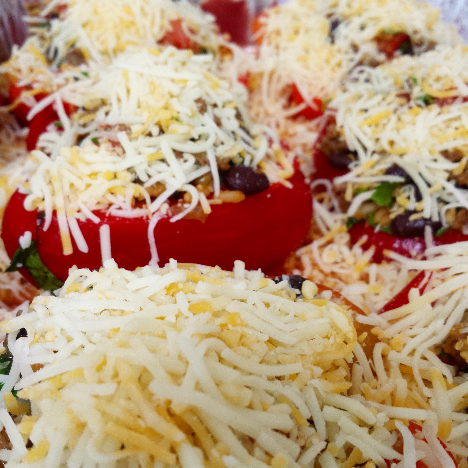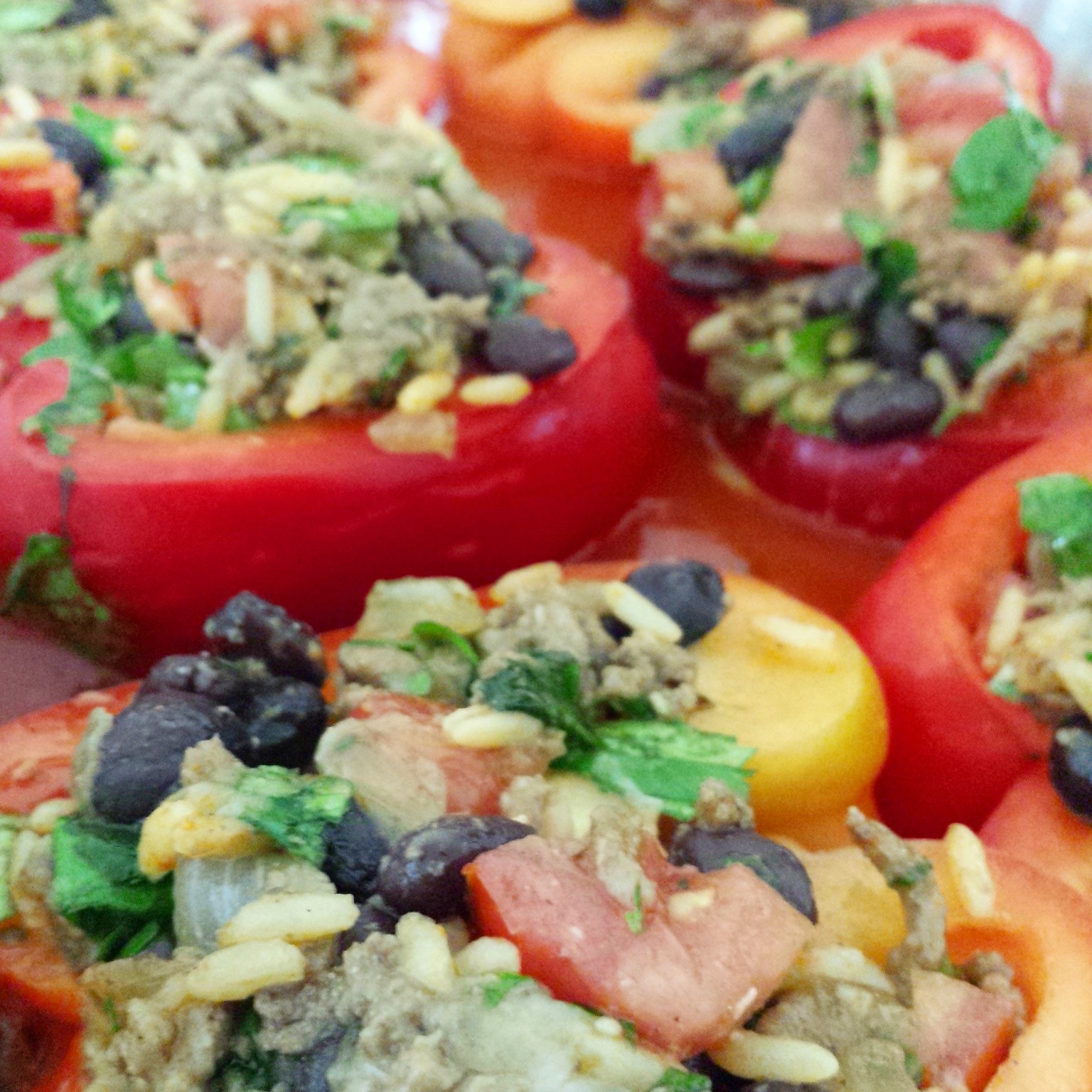 Decided to use a fresh tomato this time (I was sick of canned, diced tomatoes) and I halved the peppers vertically this time. That made for more manageable portion sizes.
