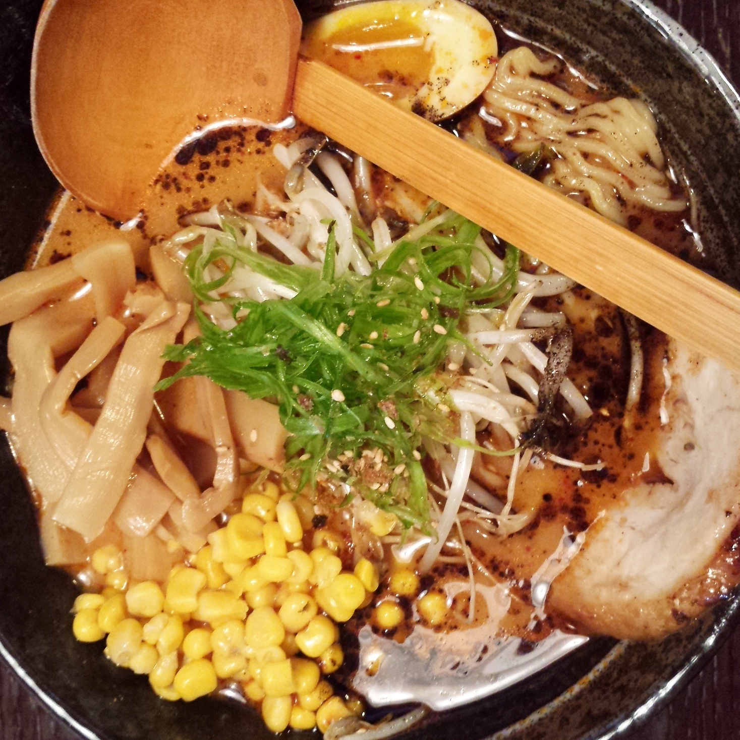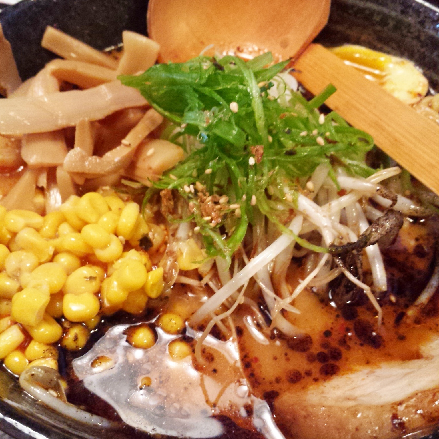 As for the ramen I got, it appeared to have burnt garlic oil on top. I ordered the bowl with extra corn and bamboo shoots, which added some texture to the dish. The pork was pretty light. The broth was peppery, I thought. Not bad. The egg was absolutely delicious. The noodles were good, too. Here’s a closeup: