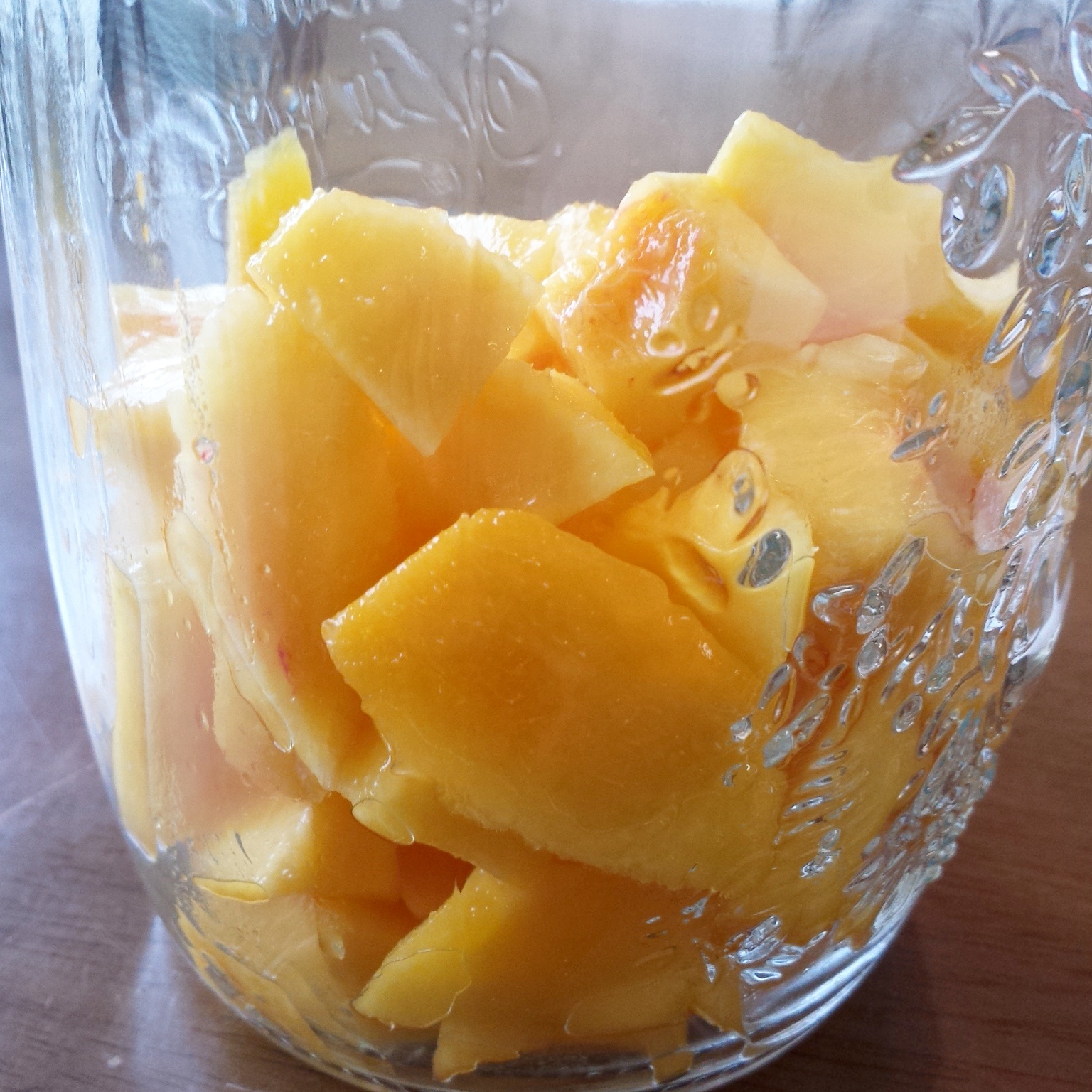 Now, I had 16 peaches. Eight of them were ripe (conveniently), and eight needed a few days. I quartered the first eight and threw them in the mason jar: